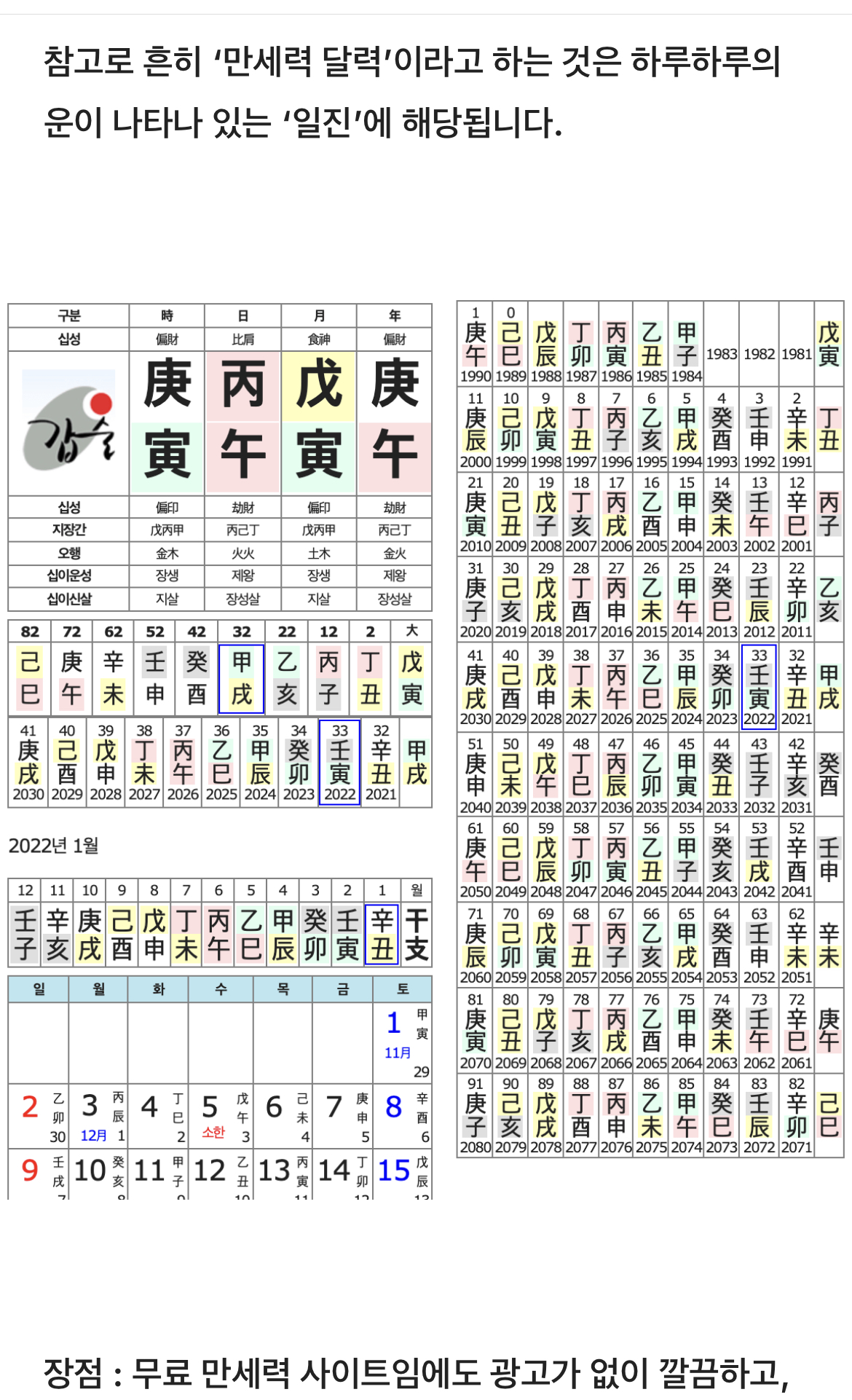 장점 : 한자의 음을 한글로 표기한 한글 만세력으로 확인할 수 있고, 만세력 달력보기가 있어 편리합니다.