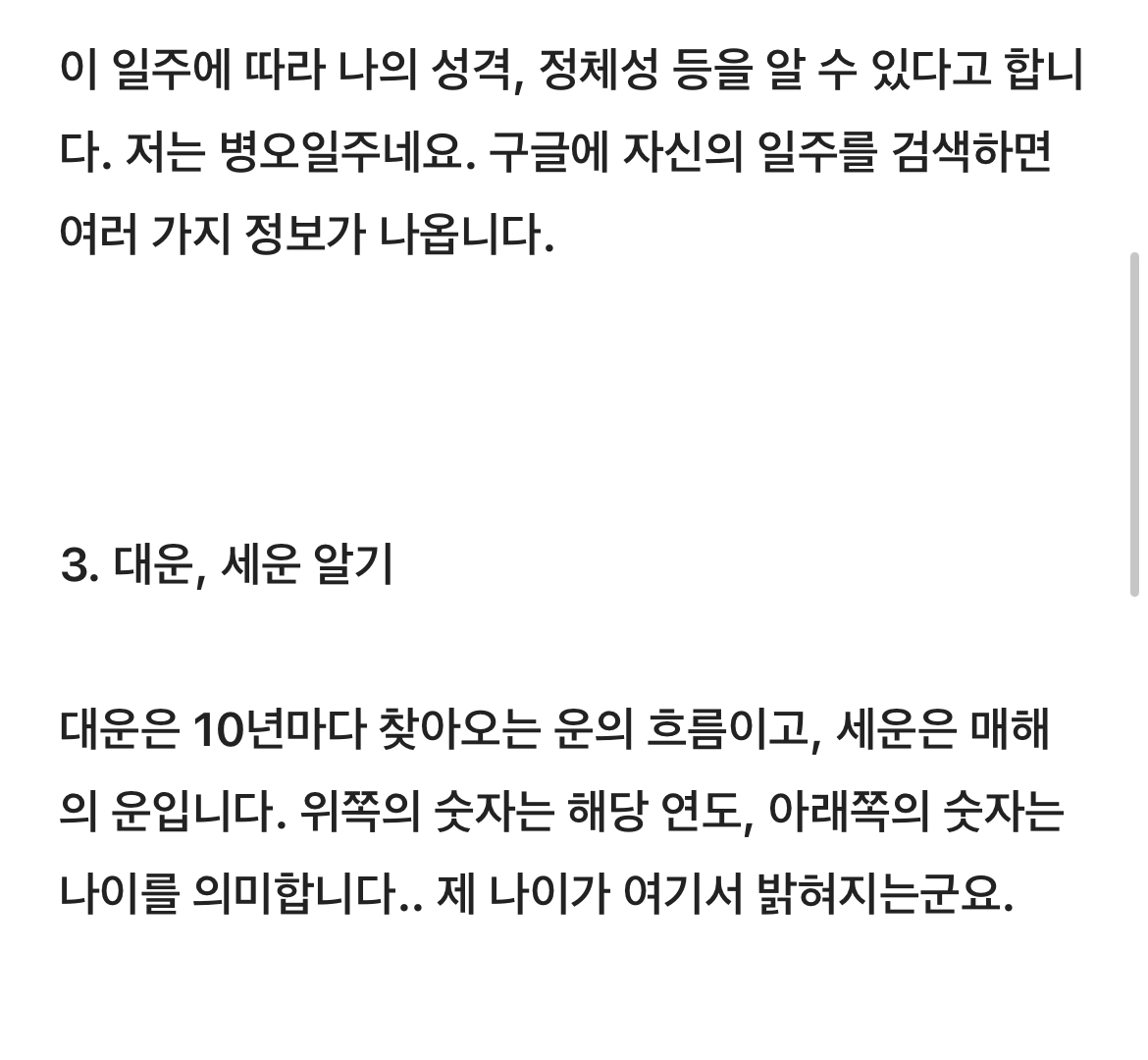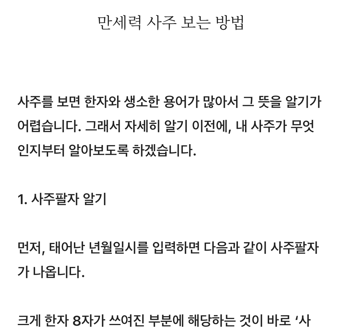 즉, 사주를 본다고 하는 것은 곧 자신의 사주팔자를 만세력으로 분석해 특정 시기(미래)를 내다보는 것이라고 할 수 있겠습니다.