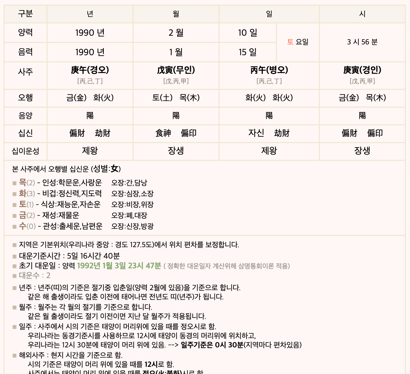 이 만세력과 사람의 사주를 조합, 사주팔자 만세력을 조회해 음양오행의 기운이 어떤 영향을 주는지 알 수 있습니다.