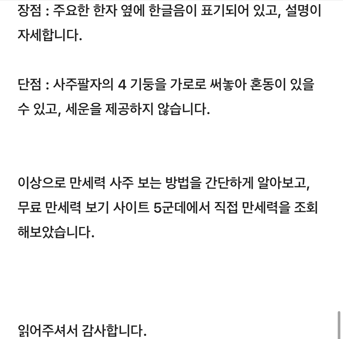 장점 : 한글 만세력으로 알아보기 쉽고, 대운이나 세운의 나이가 헷갈리기 쉬운데 만나이임이 표기되어 있습니다.